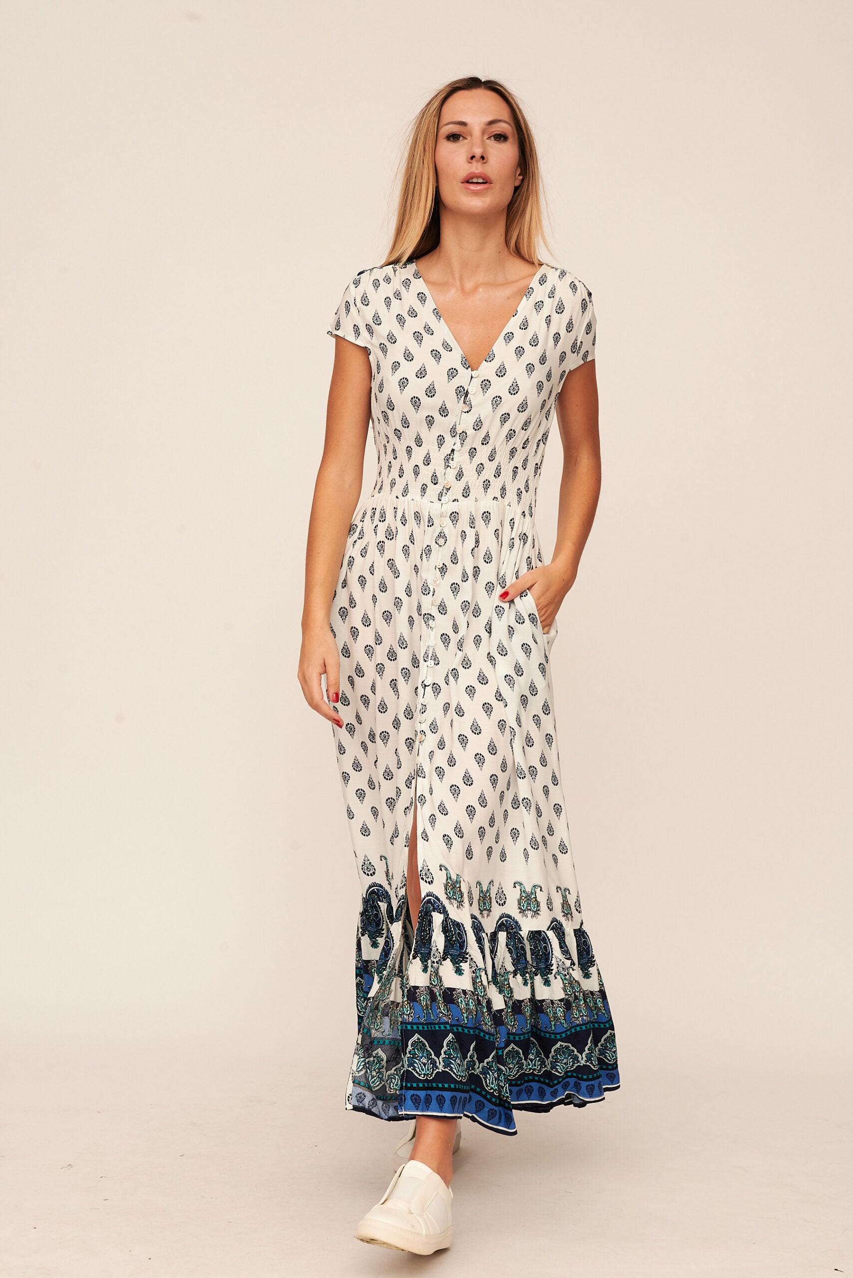 Vestido largo en color blanco, con estampado Paisley. De manga corta y abotonado en el frontal. Permite ajustar para una mayor comodidad.